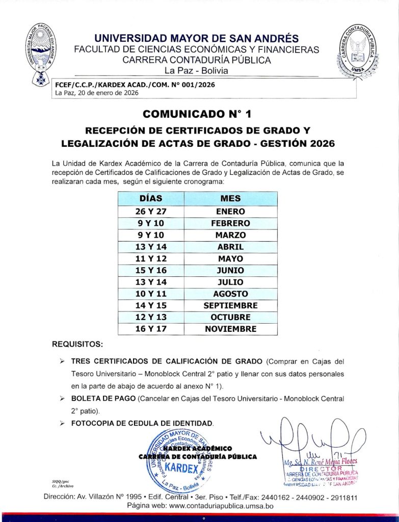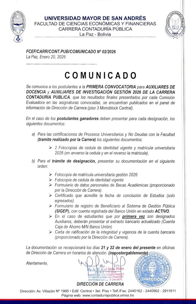 Se comunica a los postulantes a la Primera Convocatoria para Auxiliares de Docencia y Auxiliares de Investigación Gestión 2026 de la Carrera Contaduría Pública, que los resultados finales presentados por cada Comisión Evaluadora en las asignaturas convocadas, se encuentran publicadas en el panel de Información de Dirección de Carrera (Piso 3 Monoblock Central).