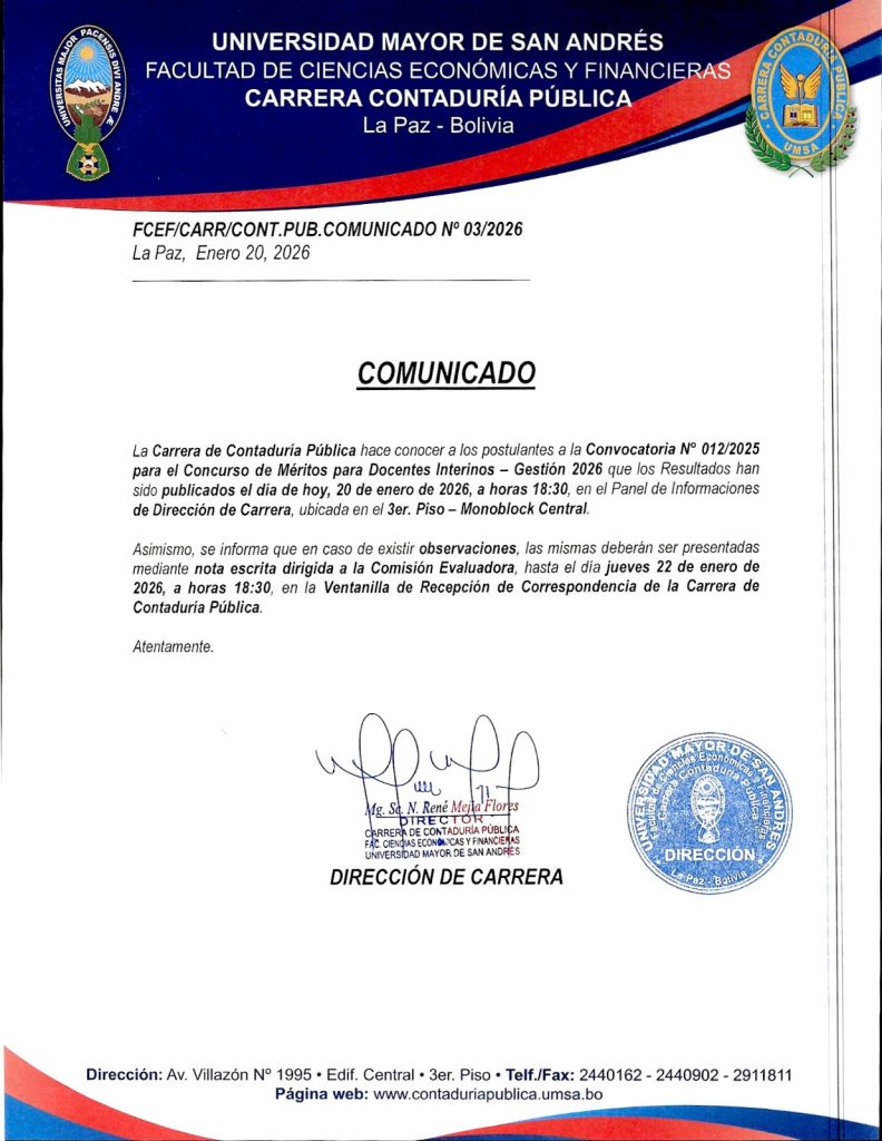 La Carrera Contaduría Pública hace conocer a los postulantes a la Convocatoria Nro. 012/2025 para el concurso de Méritos para Docentes Interinos – Gestión 2026 que los resultados han sido publicados en día de hoy 20 de enero de 2026, a horas 18:30 en el panel de informaciones de Dirección de Carrera, ubicada en el 3er. Piso – Monoblock Central.