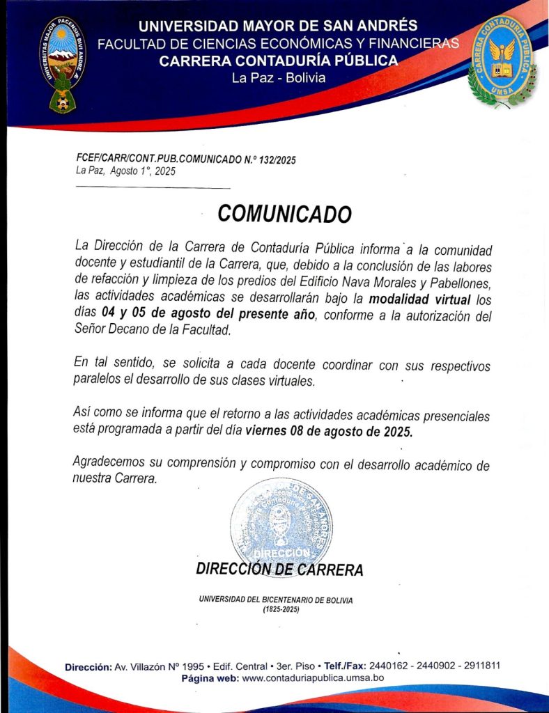 La dirección de la carrera de contaduría publica informa a la comunidad docente y estudiantil de la Carrera, que debido a la conclusión de las labores de refacción y limpieza de los predios del Edif. Nava Morales y Pabellones las actividades académicas se desarrollarán bajo la modalidad virtual los días 04 y 05 de agosto del presente año, conforme a la autorización del señor decano de la facultad.