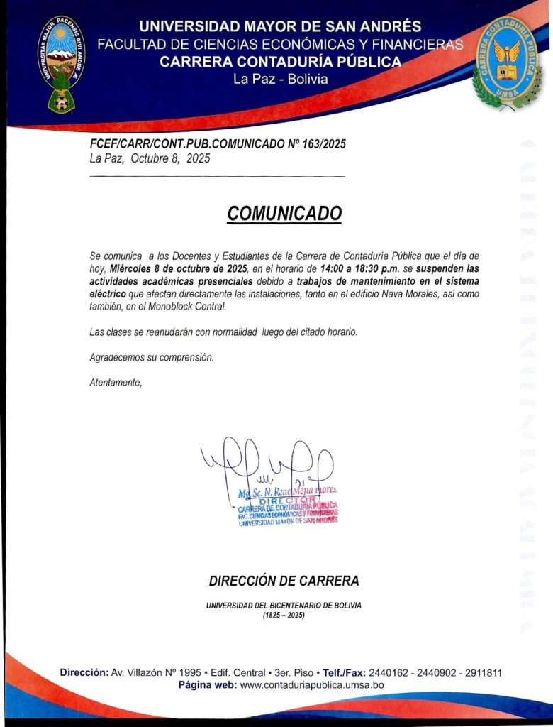 Se comunica a los Docentes y Estudiantes de la Carrera de Contaduría Pública que el día de hoy, miércoles 8 de octubre de 2025, en el horario de 14:00 a 18:30 p.m. se suspenden las actividades que afectan directamente las instalaciones, tanto en el Edificio Nava Morales, así como también en el Monoblock Central.