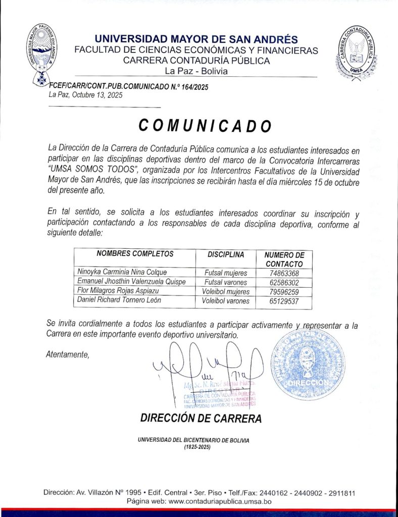La Dirección de la Carrera Contaduría Pública comunica a los estudiantes interesados en participar en las disciplinas dentro de marco de la Convocatoria Intercarreras «UMSA SOMOS TODOS», organizada por los Intercentros Facultativos de la Universidad Mayor de San Andrés, que las inscripciones se recibirán hasta el día miércoles 15 de octubre del presenta año.