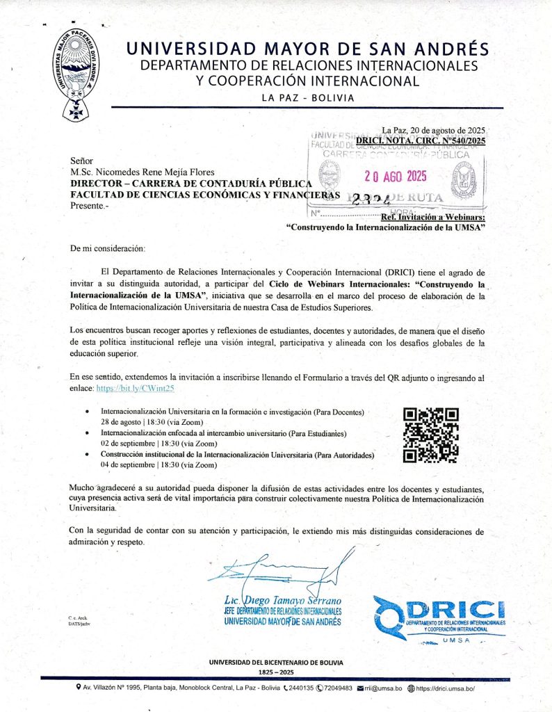 El Departamento de Relaciones Internacionales y Cooperación Internacional (DRICI) tiene el agrado de invitar a su distinguida autoridad, a participar del Ciclo de Webinars Internacional: «Construyendo la Internacionalización de la UMSA», iniciativa que se desarrolla en el marco del proceso de elaboración de la Política de Internacionalización Universitaria de nuestra Casa de Estudios Superiores.