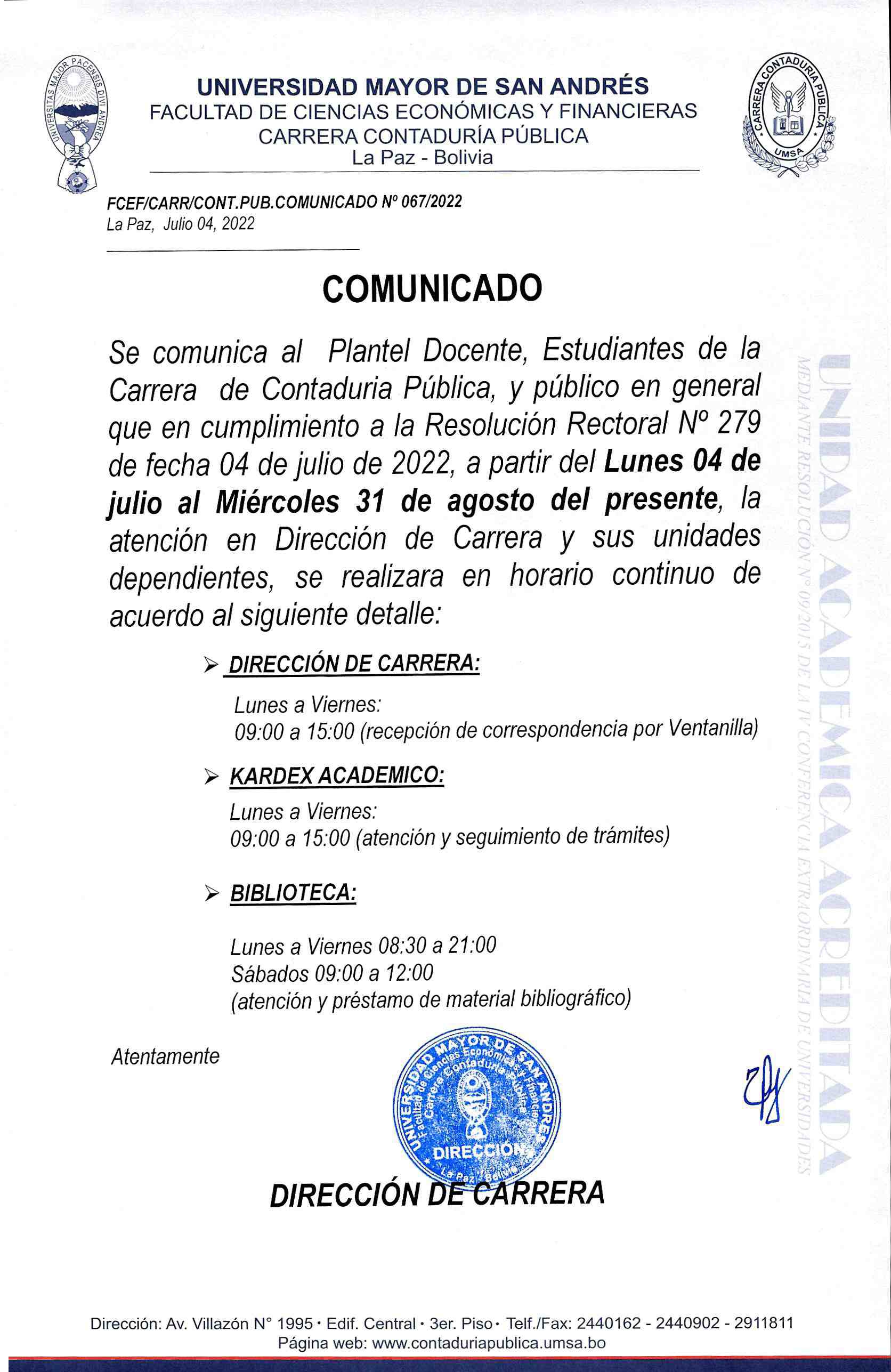 Se comunica al Plantel Docente, Estudiantes de la Carrera de Contaduría Pública, y público en general que en cumplimiento a la Resolución Rectoral N° 279 de fecha 04 de julio de 2022, a partir del Lunes 04 de julio al Miércoles 31 de agosto del presente, la atención en Dirección de Carrera y sus unidades dependientes, se realizara en horario continuo de acuerdo al siguiente detalle: