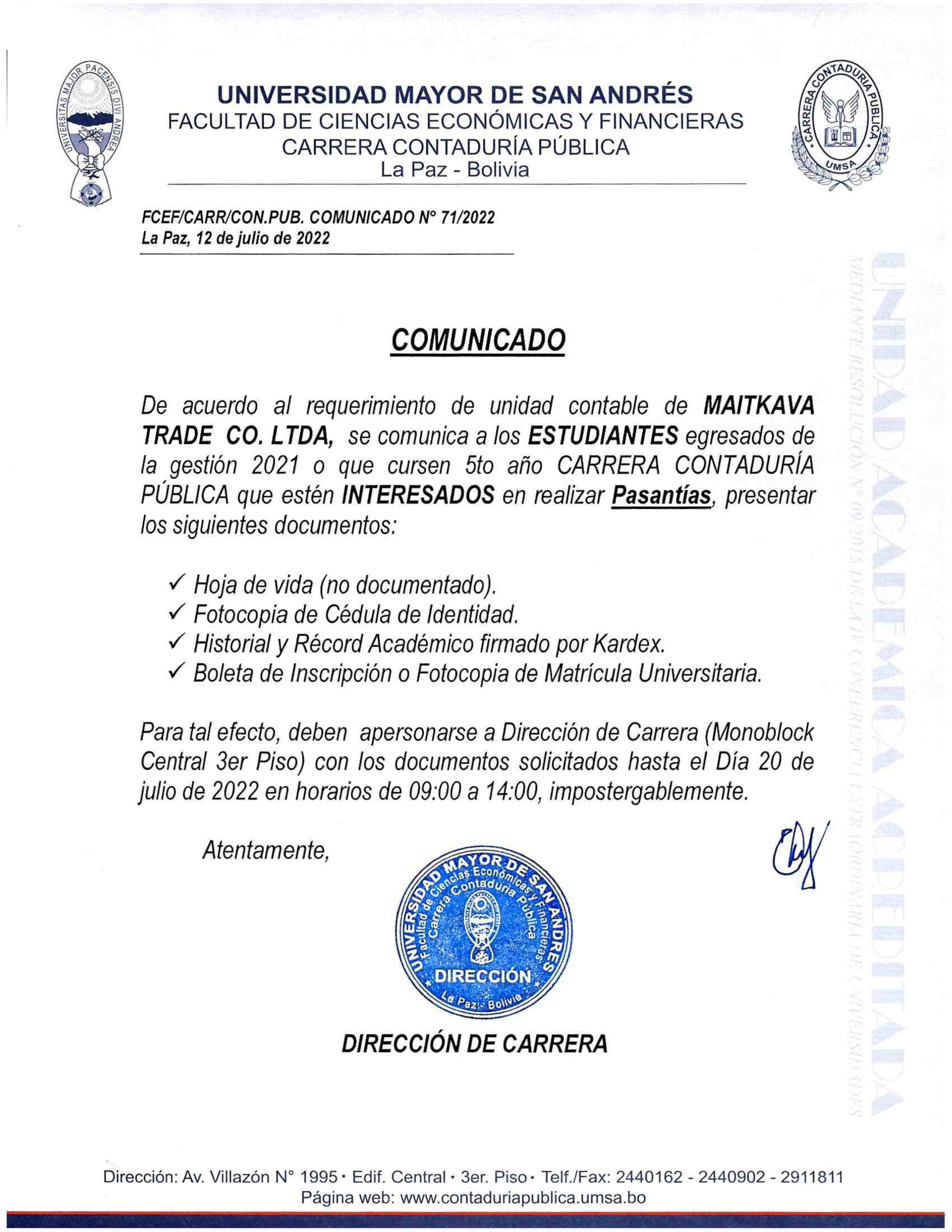 De acuerdo al requerimiento de unidad contable de MAITKAVA TRADE CO. LTDA, se comunica a los ESTUDIANTES egresados de la gestión 2021 o que cursen 5to año Carrera Contaduría Pública que estén INTERESADOS en realizar Pasantías, presentar los siguientes documentos: