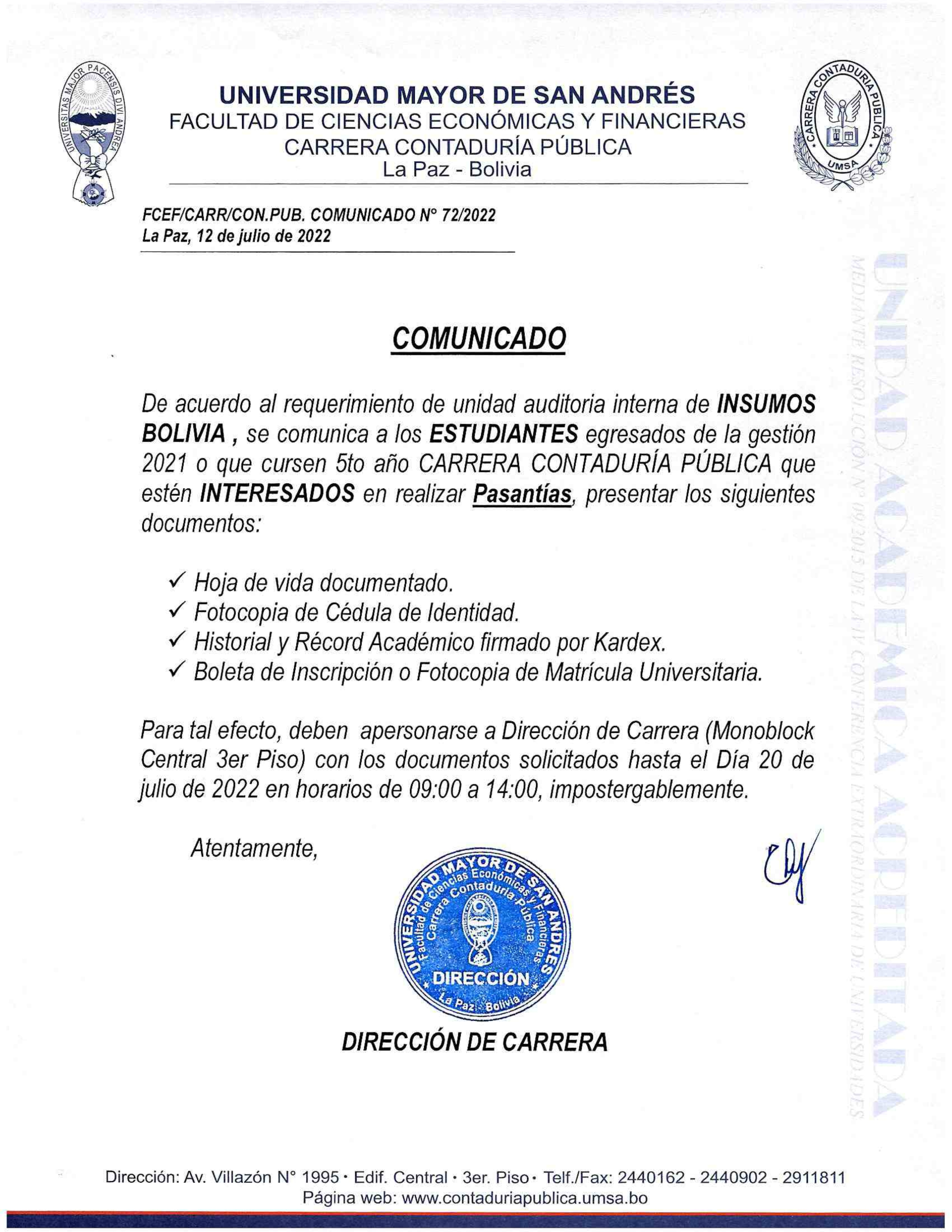 De acuerdo al requerimiento de unidad auditoria interna de INSUMOS BOLIVIA, se comunica a los ESTUDIANTES egresados de la gestión 2021 o que cursen 5to año CARRERA CONTADURÍA PÚBLICA que estén interesados en realizar Pasantías, presentar los siguientes documentos: