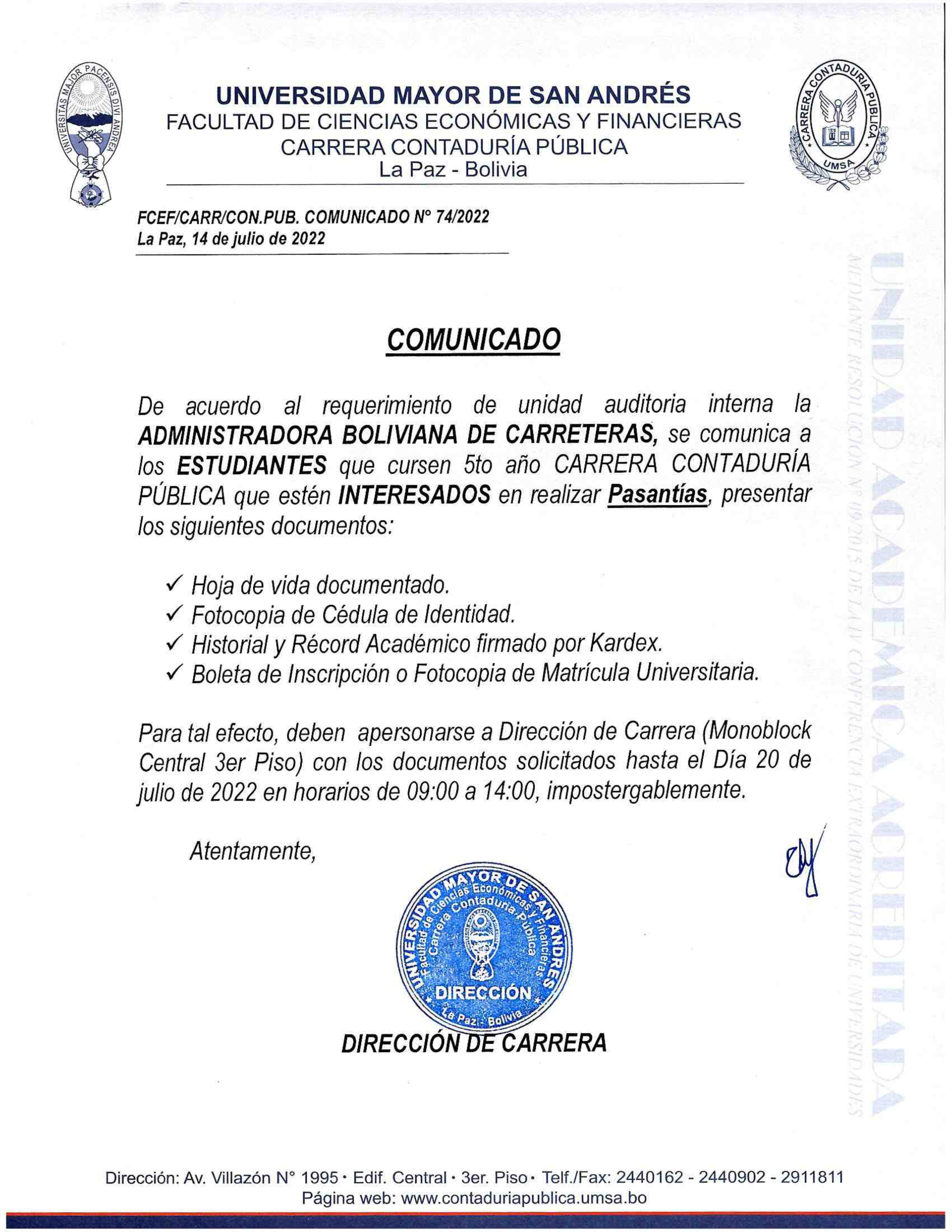 De acuerdo al requerimiento de unidad auditoria interna la ADMINISTRADORA BOLIVIANA DE CARRETERAS, se comunica a los ESTUDIANTES que cursen 5to año CARRERA CONTADURÍA PÚBLICA que estén INTERESADOS en realizar Pasantías, presentar los siguientes documentos:
